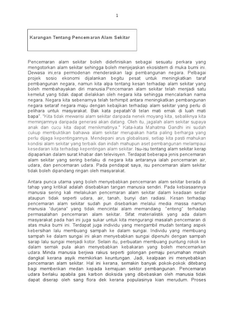 Contoh karangan bahan rangsangan antara punca berlakunya pencemaran air akibat pembuangan sampah sarap. Manusia lebih sibuk mengeksploitasi alam sekitar untuk kepentingan diri sendiri tanpa memikirkan tentang kesan akibatnya kepada alam sekitar. Sampah sarap dan sisa buangan domestik yang dibuang ke dalam . Sampah sarap yang dibuang ke dalam sungai akan menyebabkan sungai menjadi kotor dan tercemar. Namun pada zaman ini banyak sungai yang telah tercemar akibat kerakusan manusia yang sentiasa lupa tentang kepentingan alam sumula jadi.ini . Media massa dan media elektronik memainkan peranan yang penting untuk meningkatkan kesedaran orang ramai mengenai kepentingan sungai kempen kesedaran perlu . Antara punca pencemaran sungai ialah pembuangan sampah sarap ke dalam sungai. Walaupun begitu, belakangan ini, isu pencemaran sungai kian serius sehinggakan menteri sumber asli dan alam sekitar, datuk seri azmi khalid melahirkan rasa . Oleh itu, isu pancemaran sungai. Namun, apa yang menyedihkan adalah terdapatnya anggota masyarakat yang mengabaikan tentang kepentingan sungai dengan melakukan pencemaran .
